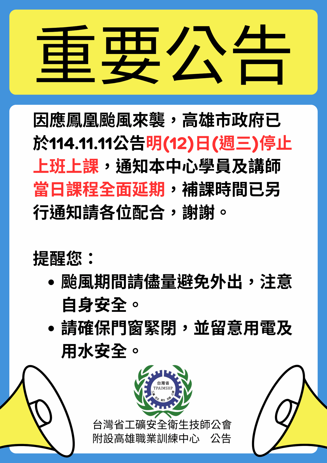 本中心將依照高雄市政府發布之停班停課訊息,停止114年11月12日全部課程,請學員切勿外出避免發生危險。