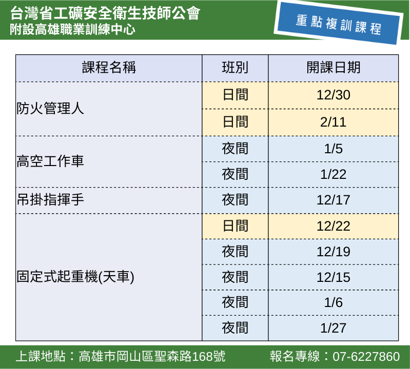 內政部消防署於113年12月26日發文公告,關於防火管理員、服勤人員、保安監督人、保安檢查員、液化石油氣零售業安全技術人員及爆竹煙火監督人應在其訓練合格證書有效期間內接受複訓,逾越該證書有效期間未接受複訓者,應重新接受初訓以符合規範。