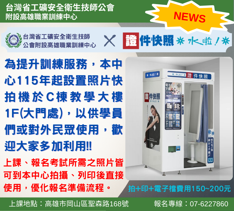 2.為提升訓練服務,本中心115年起設置照片快拍機於C棟教學大樓1F(大門處),以供學員們或對外民眾使用,歡迎大家多加利用!!(上課、報名考試所需之照片皆可到本中心拍攝、列印後直接使用,優化報名準備流程。)